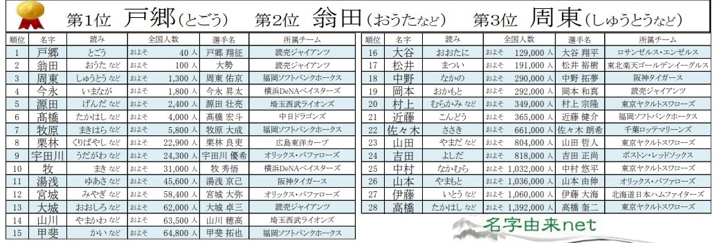 大谷、甲斐、源田、村上、周東、牧…野球WBC日本代表選手、「レア名字」1位は?