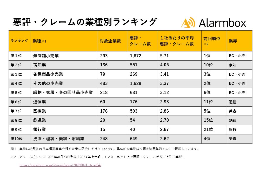 2023年下半期「インターネット上で悪評・クレームが多い上位10業種」発表 1位の業種「1社あたり5.71件」のクレーム数