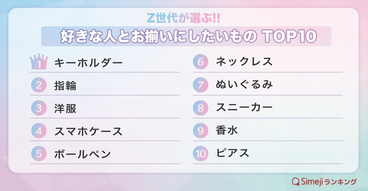 Z世代が「好きな人とおそろいにしたいもの」TOP10 「洋服」「指輪」を上回った1位は?