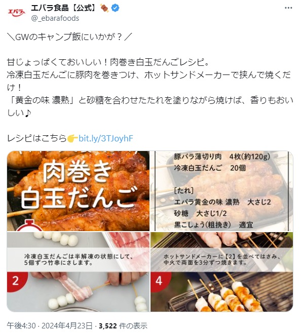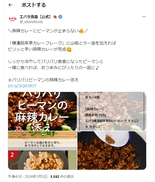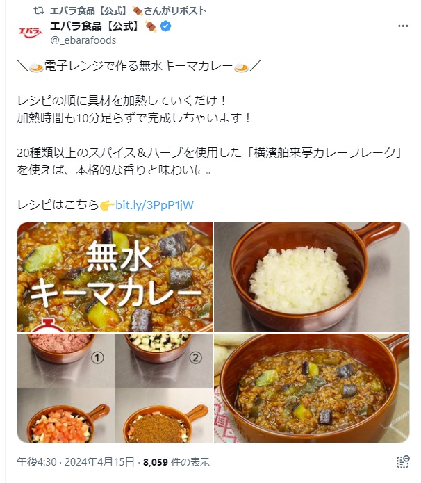 無水キーマカレー、ライスバー…エバラ食品が紹介するレシピが「簡単でおいしそう」と話題 「電子レンジで作る無水キーマカレー」(エバラ食品工業の公式Xアカウントより) 「電子レンジで作る無水キーマカレー」の作り方(エバラ食品工業の公式サイトより) 「パリパリピーマンの麻辣カレー添え」(エバラ食品工業の公式Xアカウントより) 「パリパリピーマンの麻辣カレー添え」の作り方(エバラ食品工業の公式サイトより) 「ネギージョ」(エバラ食品工業の公式Xアカウントより) 「ネギージョ」の作り方(エバラ食品工業の公式サイトより) 「五平餅風のライスバー」(エバラ食品工業の公式Xアカウントより) 「五平餅風のライスバー」の作り方(エバラ食品工業の公式サイトより) 「肉巻き白玉だんご」(エバラ食品工業の公式Xアカウントより) 「肉巻き白玉だんご」の作り方(エバラ食品工業の公式サイトより) 関連記事 “飛び過ぎるバット”の発想を応用したドライバーの実力を検証 (PR)ミズノ 旬の「新タマネギ」の甘さ引き立つ! 少ない材料で作れる“簡単レシピ”に「今度やってみる」【JA全農が紹介】 本間ゴルフ・小川社長が語る“変革の真意” 「TW777」が示す挑戦の第一歩 (PR)本間ゴルフ レギュラーコーヒー袋の“透明テープ”って何のためにある? 味の素AGFの解説に「なるほど」「初めて知った」 長野、青森で大きな地震相次ぐ 「避難用リュック」に忘れずに入れるべき物とは 記事ページに戻る