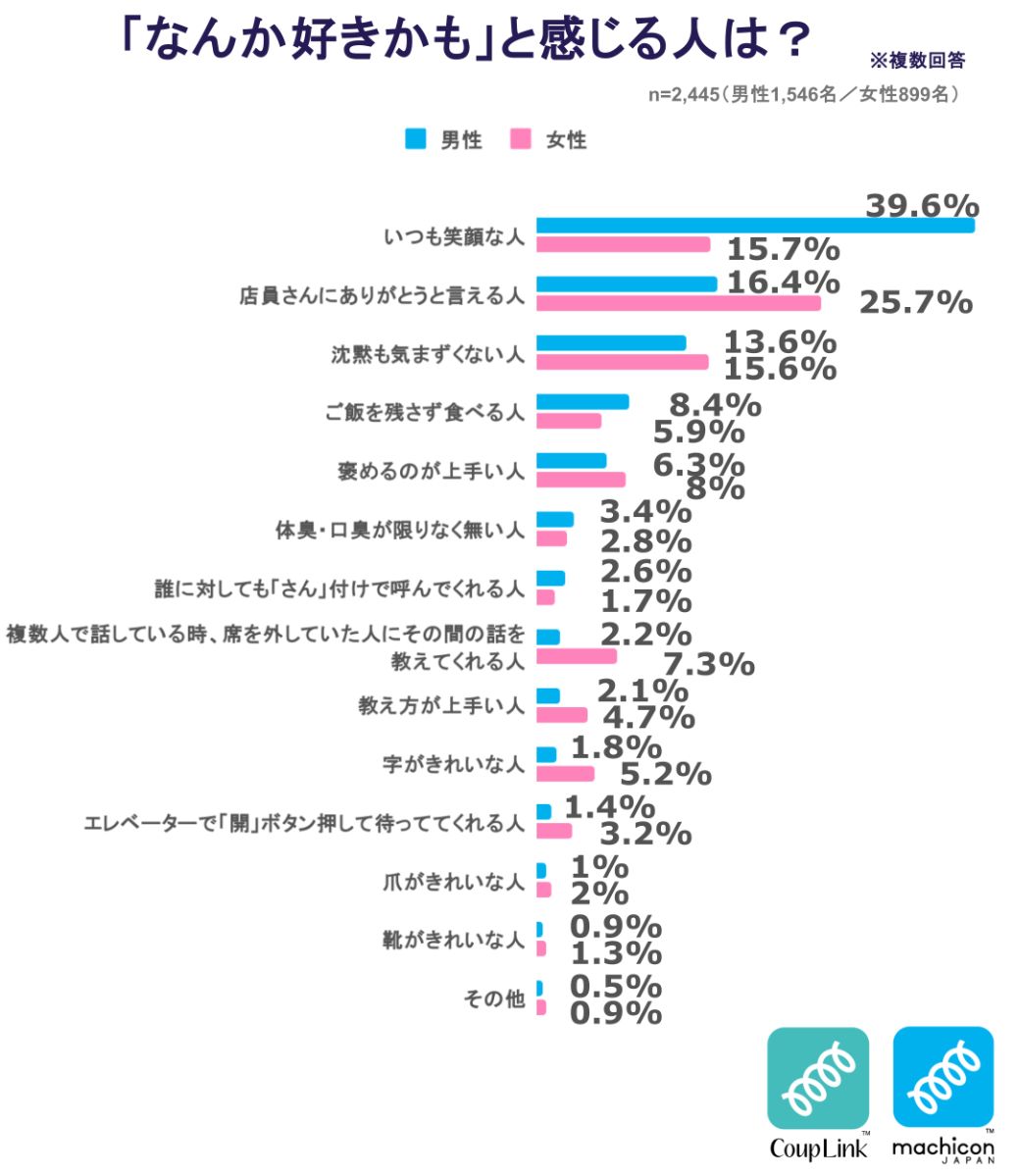 「いつも笑顔の人」「沈黙も気まずくない人」よりも好感度大! 女性800人超が答えた「なんか好きかも」と感じる人、圧倒的トップは?