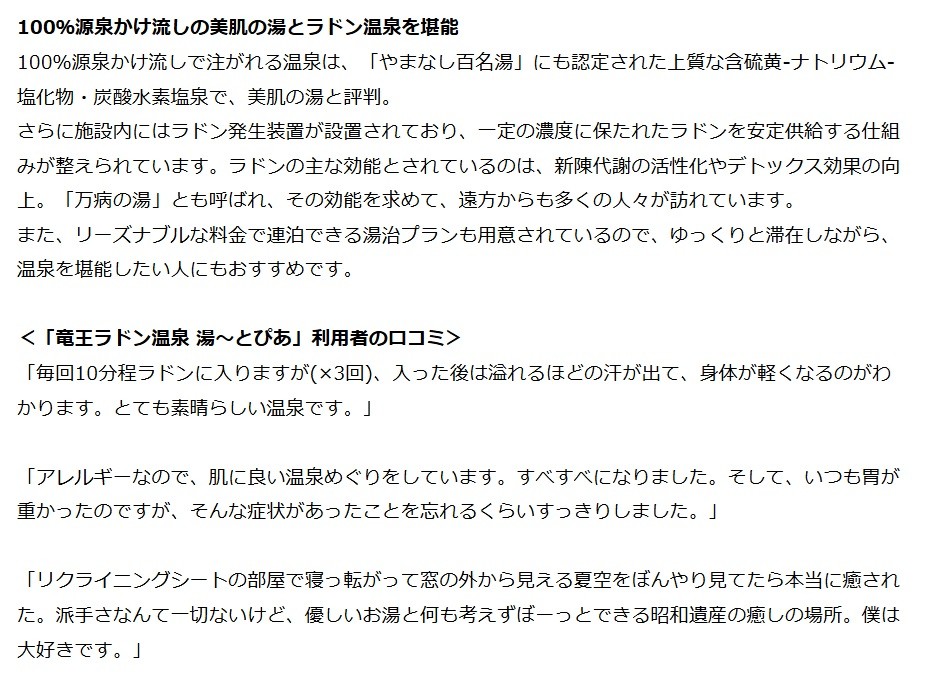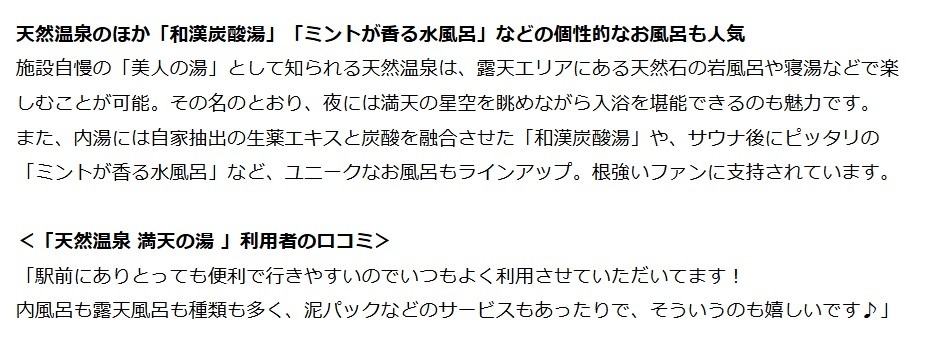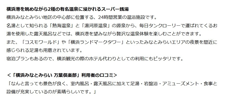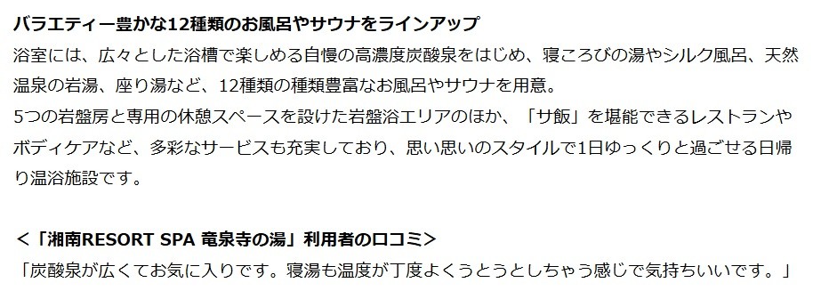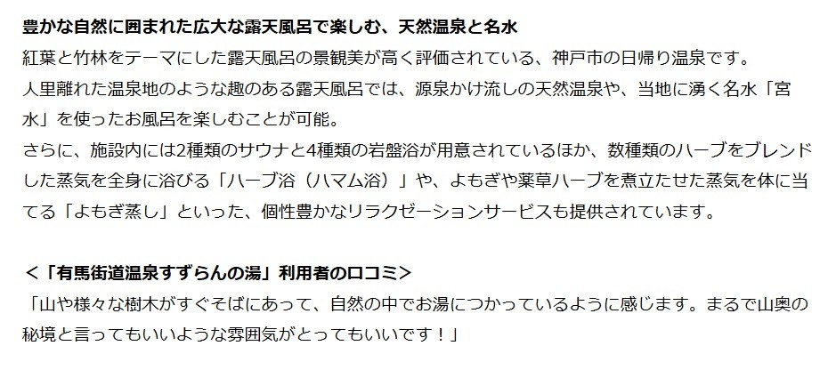 温泉・スーパー銭湯ランキング 風呂で評価! 3位「湘南RESORT SPA 竜泉寺の湯」…2位&1位は? 5位「有馬街道温泉すずらんの湯」(神戸市) 5位「有馬街道温泉すずらんの湯」(神戸市) 4位「天然温泉 満天の湯」(横浜市) 4位「天然温泉 満天の湯」(横浜市) 3位「湘南RESORT SPA 竜泉寺の湯」(神奈川県茅ヶ崎市) 2位「横浜みなとみらい 万葉倶楽部」(横浜市) 2位「横浜みなとみらい 万葉倶楽部」(横浜市) 1位「竜王ラドン温泉 湯~とぴあ」(山梨県甲斐市) 1位「竜王ラドン温泉 湯~とぴあ」(山梨県甲斐市) 記事ページに戻る
