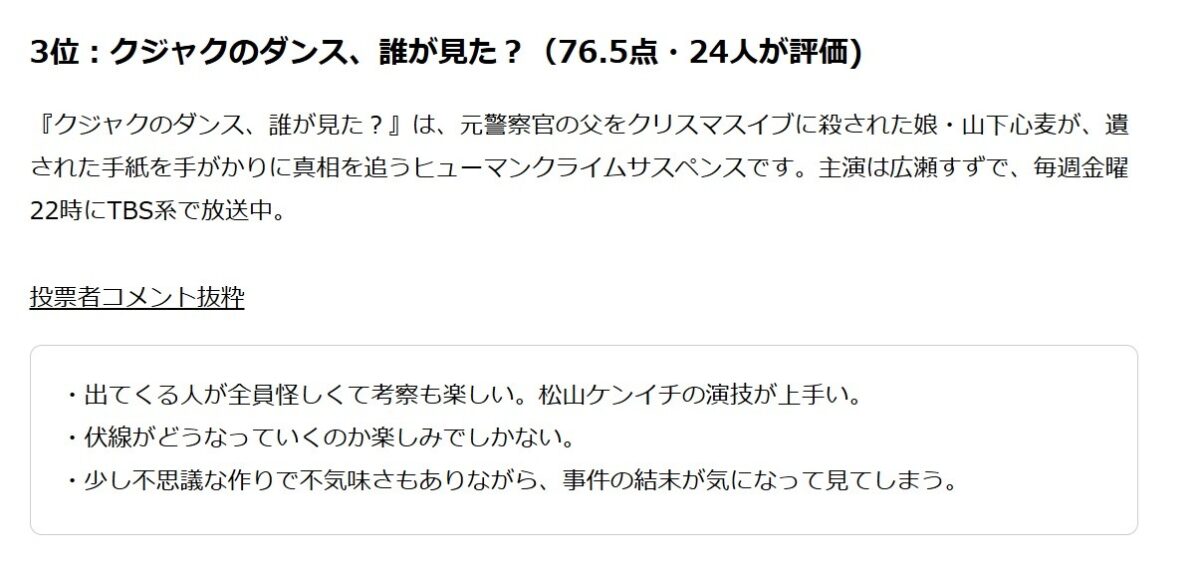 「2025年冬ドラマランキング」 3位広瀬すず「クジャクのダンス、誰が見た?」、2位松坂桃李「御上先生」…1位は?