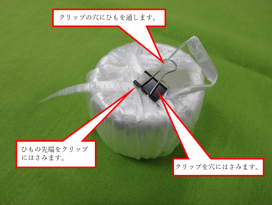 他の物を使うようでは良い方法とは思えません。経費の無駄遣いは止めましょう。ビニールひもだけで考えてね。