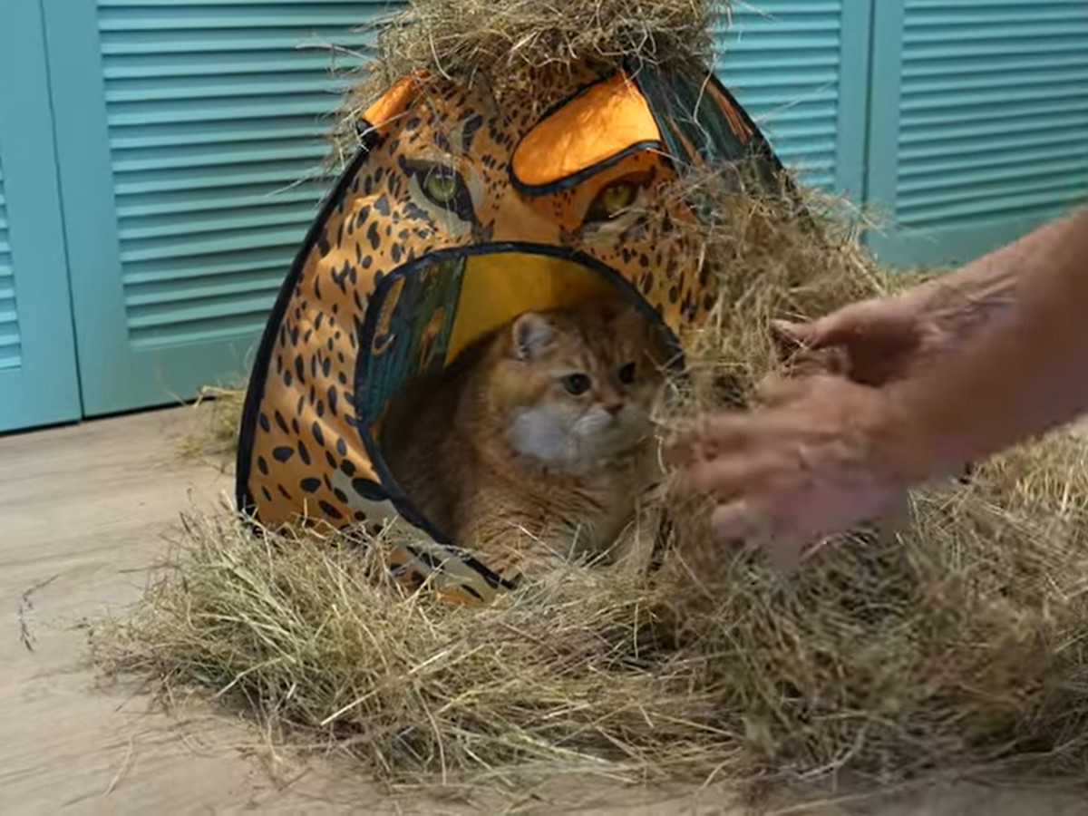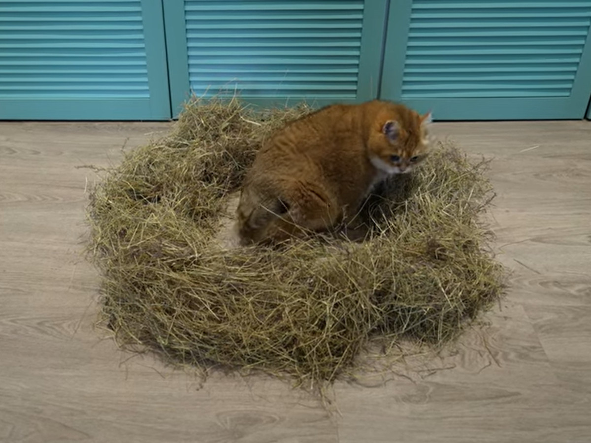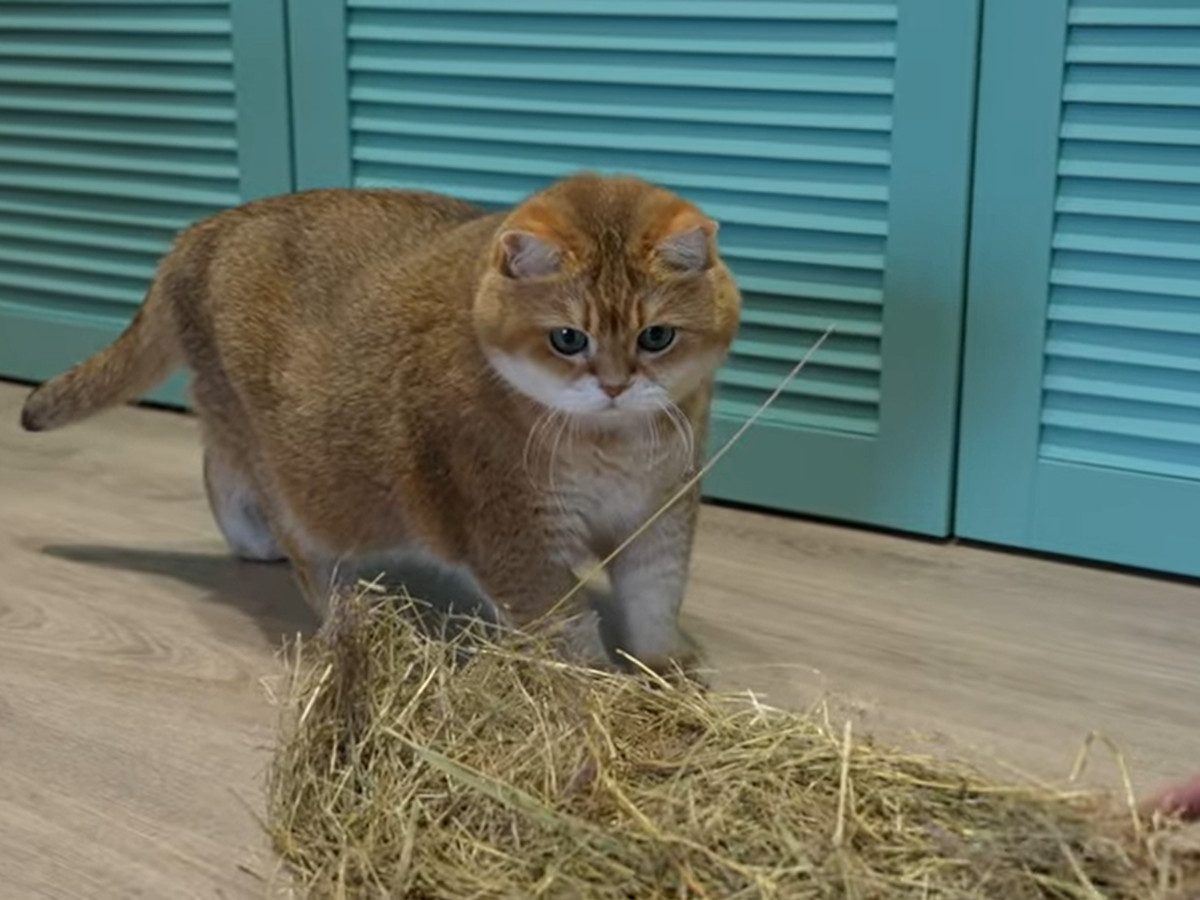 初めての「干し草」にビックリ…!? 謎の感触に戸惑う猫の“困り顔”に反響「たまらん」「本当にかわいい」