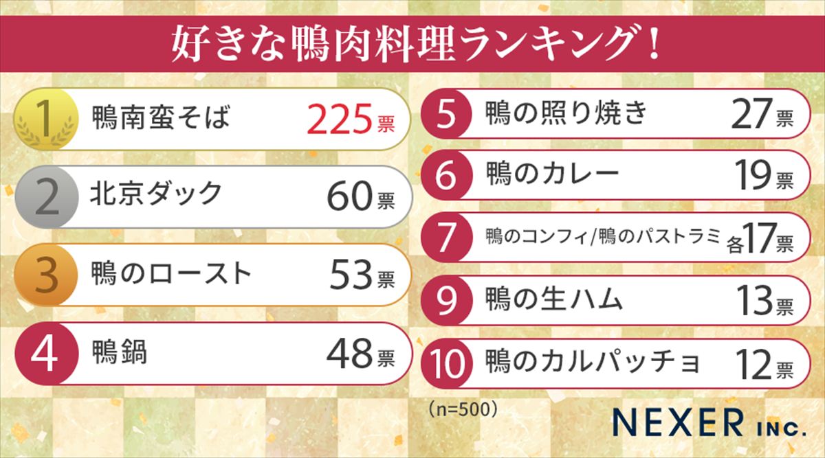 カモ肉好き500人が回答「カモ肉料理」人気ランキング 3位「ロースト」2位「北京ダック」…1位は?