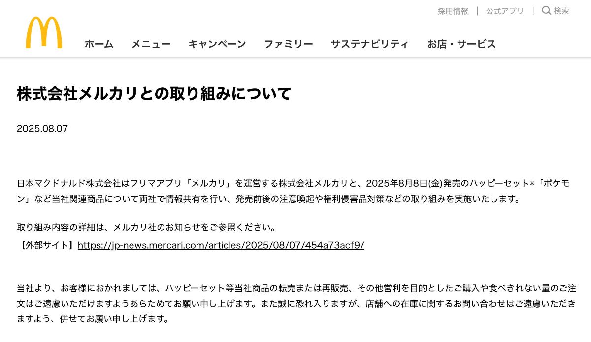 「転売ヤーに優しすぎる」 マクドナルド「ポケモン」ハッピーセット転売対策でメルカリと連携も…SNSで懸念相次ぐ 【全文】8月7日発表「株式会社メルカリとの取り組みについて」(日本マクドナルド公式サイトより) 「マクドナルド(@McDonaldsJapan)」公式Xより 記事ページに戻る