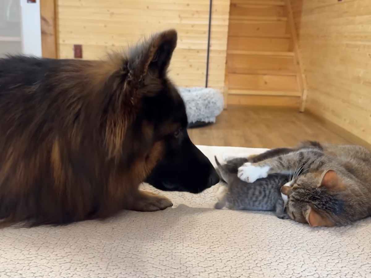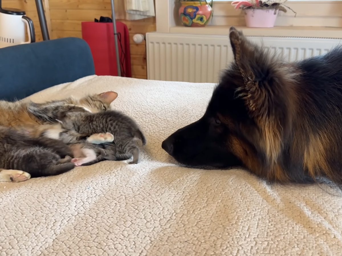 「かまってほしいのニャ~!!」6匹の子猫たちに囲まれてタジタジな大型犬…優しすぎる結末に視聴者ほっこり