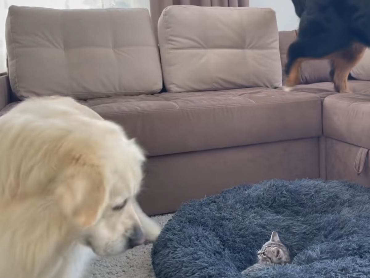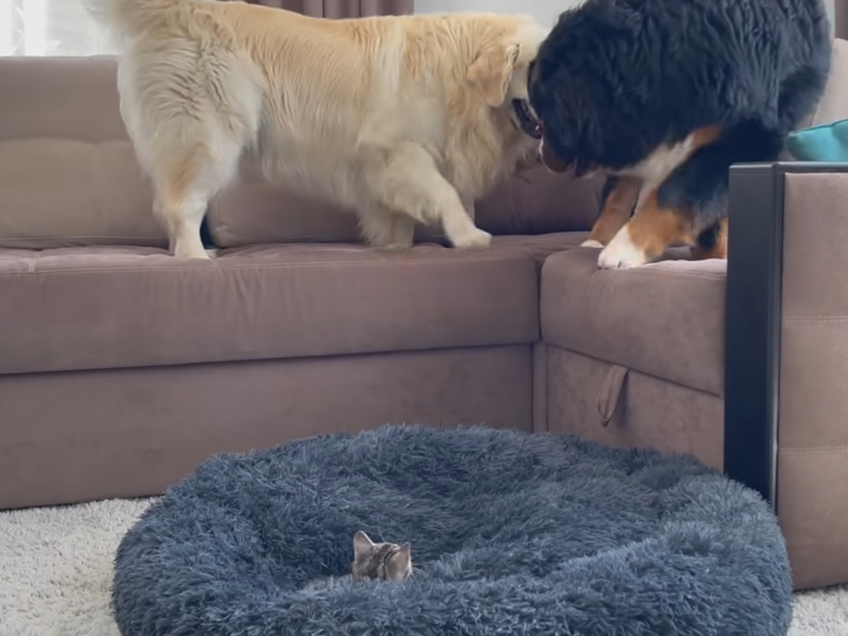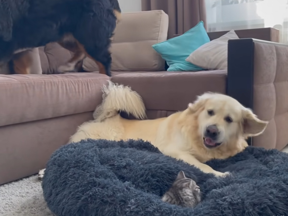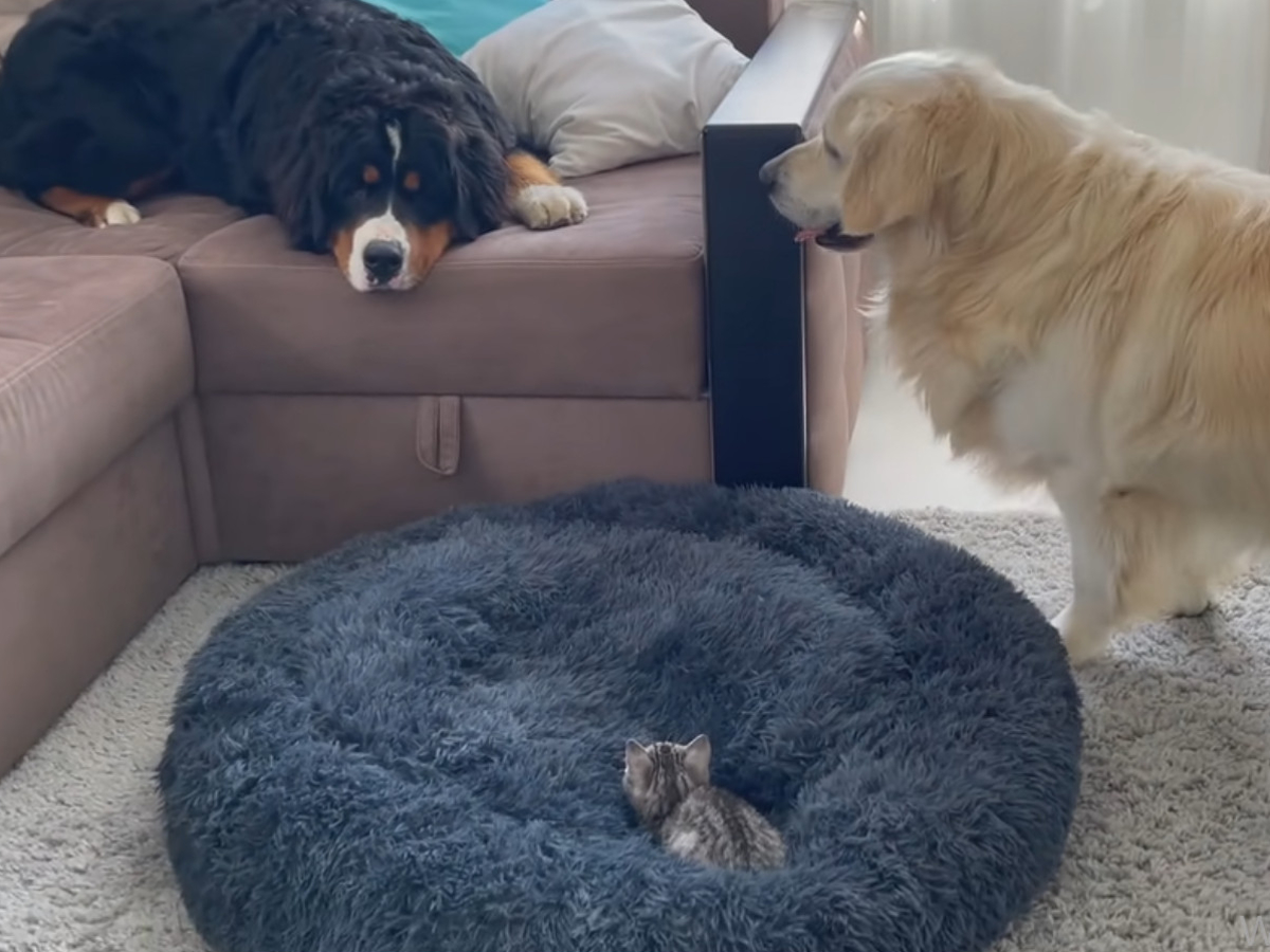 「いい加減起きてニャー!!」爆睡中の大型犬に全力アタックする子猫→大型犬の“反応”に視聴者「スゴイ包容力」