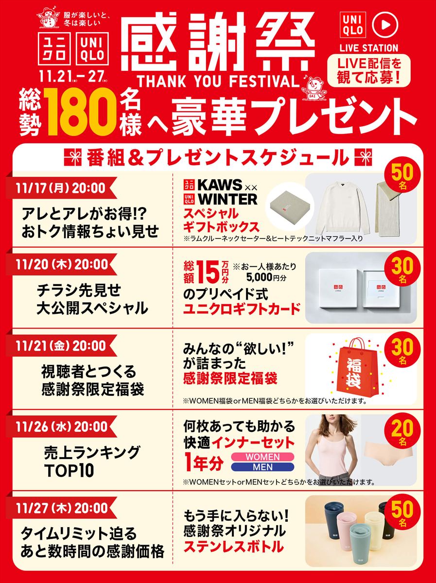 ユニクロ「感謝祭」実施 ステンレスボトル&銘品プレゼント 「GU」「PLST」も同時に開催 「GU感謝祭」のイメージビジュアル 「PLST感謝祭」のイメージビジュアル プレゼントキャンペーンのイメージビジュアル 「KAWS WINTER」のイメージビジュアル 「KAWS WINTER」のイメージビジュアル 「ステンレスボトル」のイメージビジュアル 「地域の銘品」プレゼントキャンペーンのイメージビジュアル 記事ページに戻る