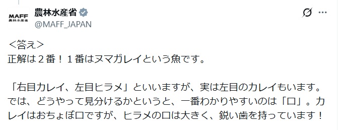 「ヒラメはどっち?」 農水省「魚クイズ」にSNS「分からない」「口の大きさで判断」
