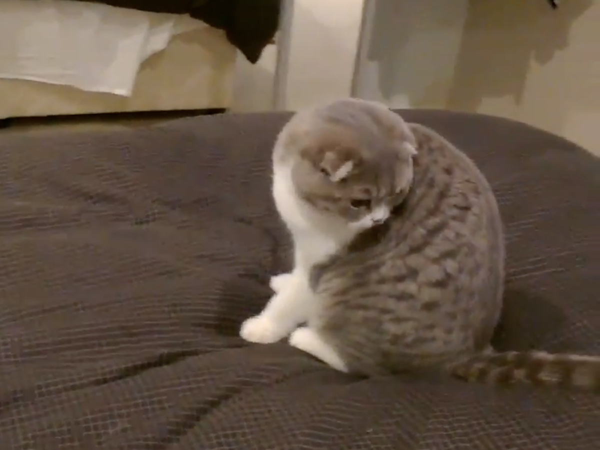 「つ、詰んだニャン…」ベッドから降りられなくなって呆然とする子猫「困り果てた顔が最高にカワイイ」視聴者が悶絶!