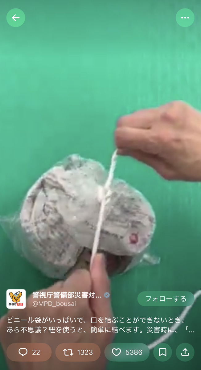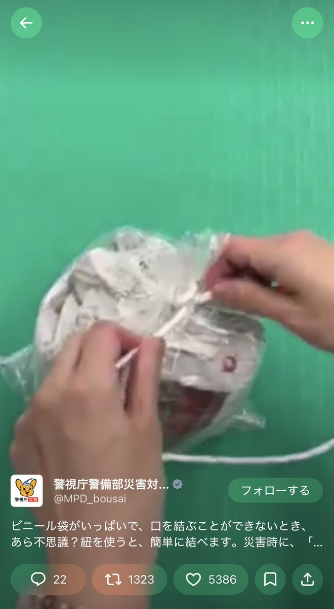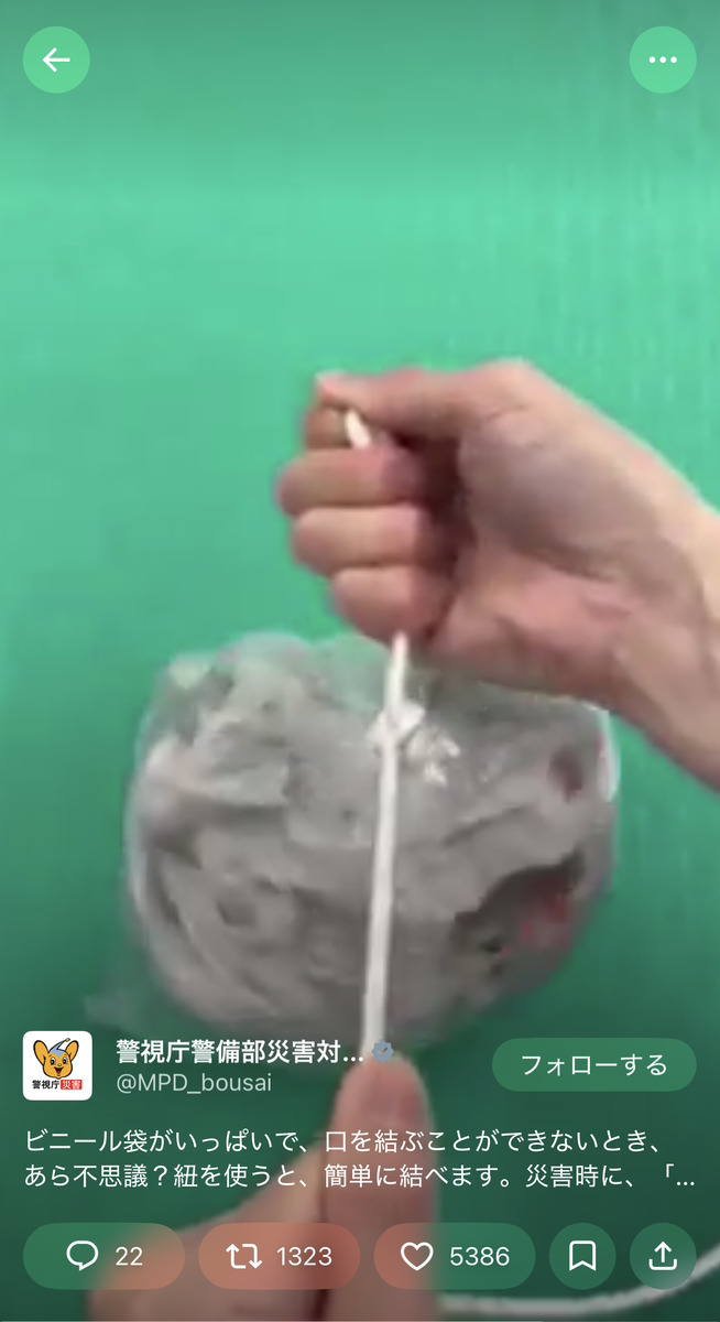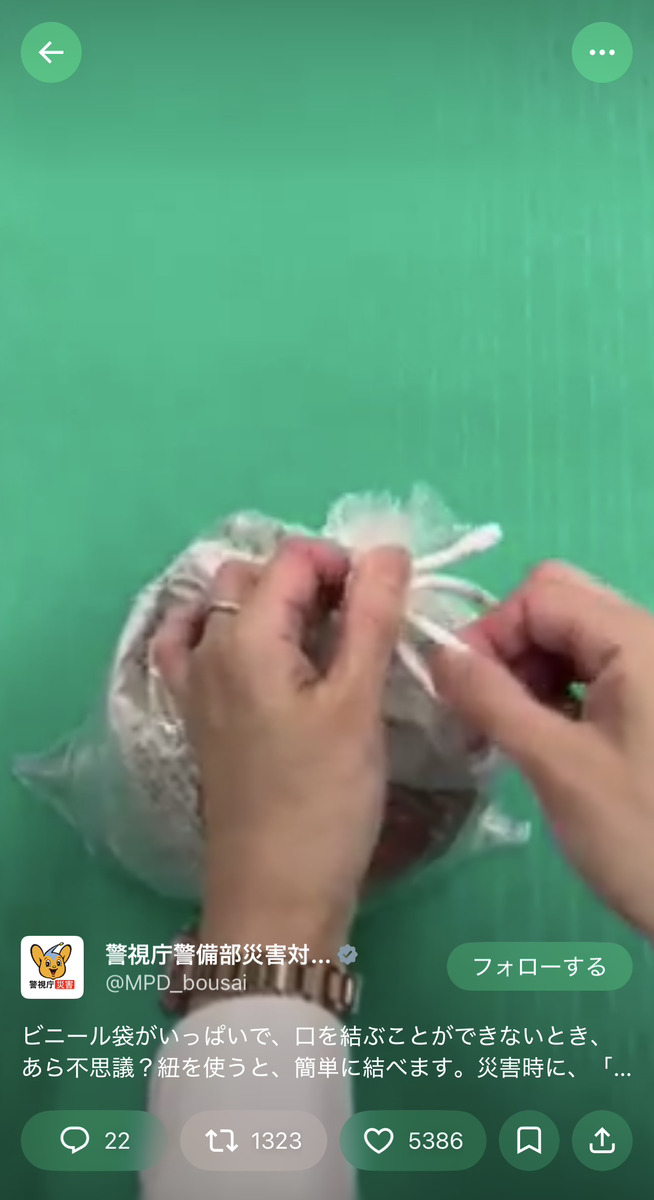 中身いっぱいのビニール袋の口、簡単に結べちゃう! 警視庁の“裏技”に「なるほど!」「手品みたい」 警視庁警備部災害対策課の公式Xアカウントより 警視庁警備部災害対策課の公式Xアカウントより 警視庁警備部災害対策課の公式Xアカウントより 警視庁警備部災害対策課の公式Xアカウントより 警視庁警備部災害対策課の公式Xアカウントより 警視庁警備部災害対策課の公式Xアカウントより 警視庁警備部災害対策課の公式Xアカウントより 警視庁警備部災害対策課の公式Xアカウントより 警視庁警備部災害対策課の公式Xアカウントより 警視庁警備部災害対策課の公式Xアカウントより 警視庁警備部災害対策課の公式Xアカウントより 警視庁警備部災害対策課の公式Xアカウントより 警視庁警備部災害対策課の公式Xアカウントより 警視庁警備部災害対策課の公式Xアカウントより 警視庁警備部災害対策課の公式Xアカウントより 警視庁警備部災害対策課の公式Xアカウントより 関連記事 “飛び過ぎるバット”の発想を応用したドライバーの実力を検証 (PR)ミズノ ナトリウムイオン電池「航空機への持ち込み不可」に…没収の恐れ エレコムの注意喚起にネット衝撃「リチウムより厳しい」 本間ゴルフ・小川社長が語る“変革の真意” 「TW777」が示す挑戦の第一歩 (PR)本間ゴルフ 【バーガーキング】ワッパーを片手できれいに!“裏技”に反響 SNS「知らなかった」「試してみます」 「あらあら~おやおや~」ハンズ公式の“におわせ”投稿が昭和生まれ直撃 80万表示の反響「懐かしすぎ!」 記事ページに戻る