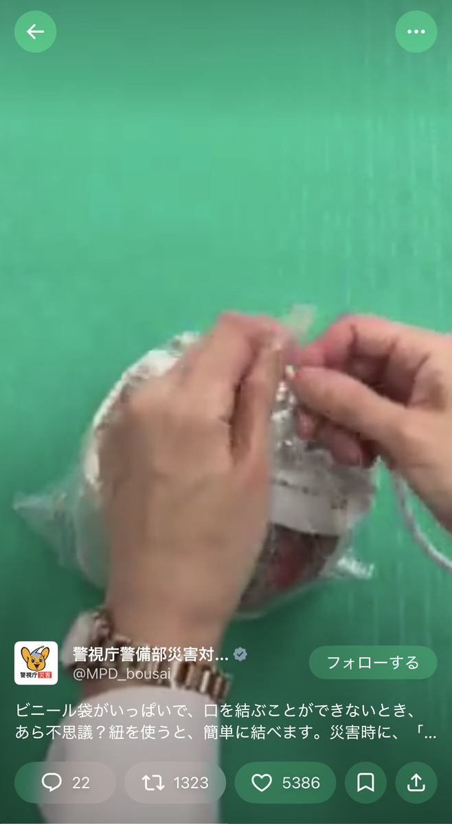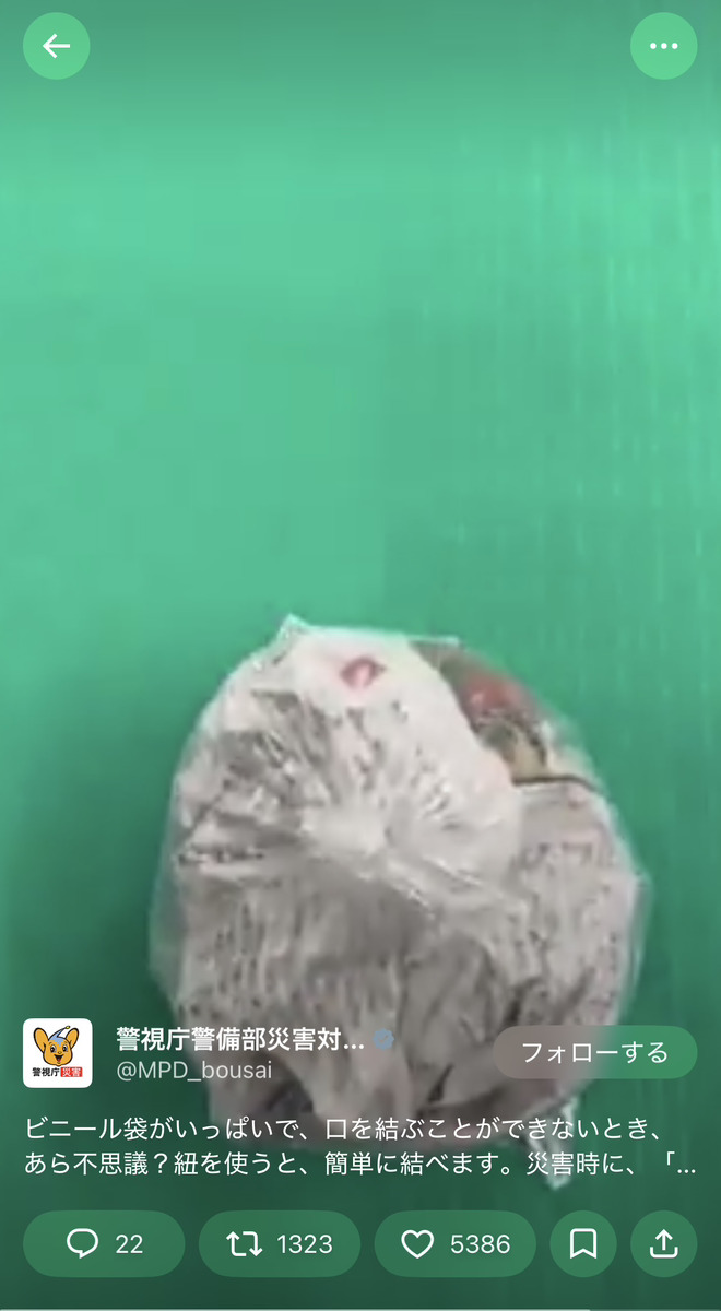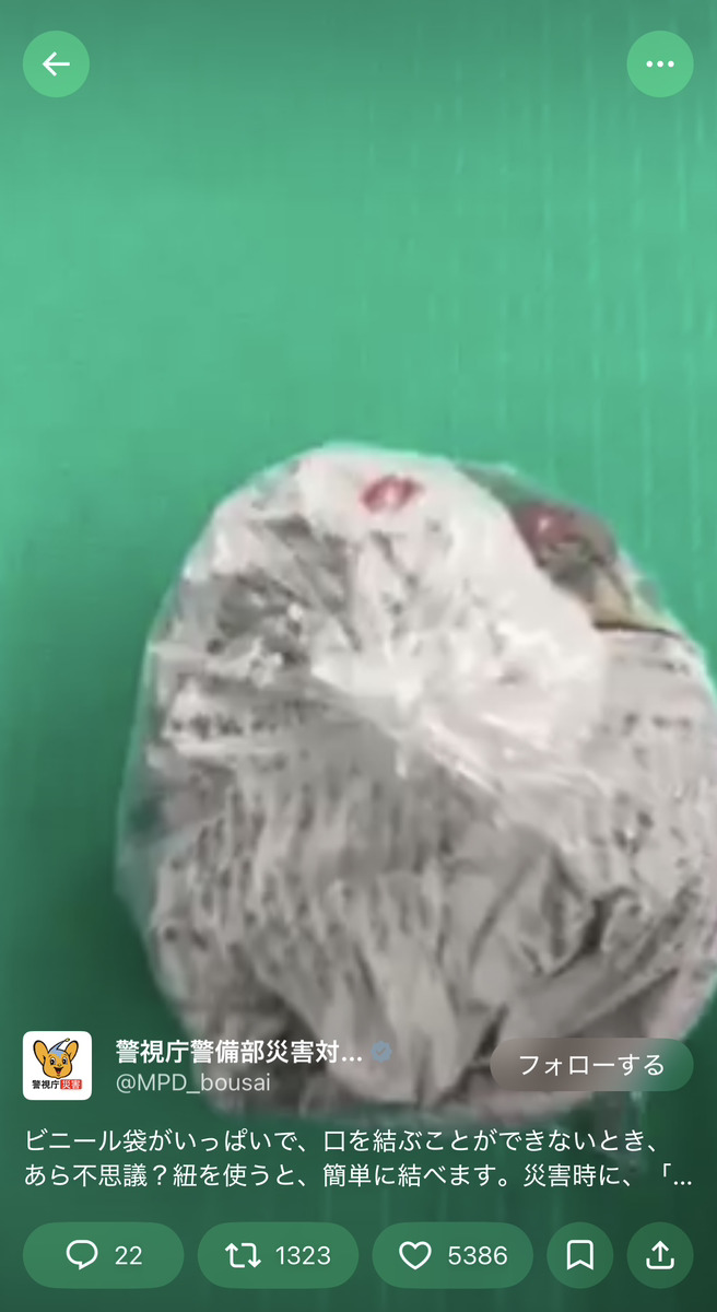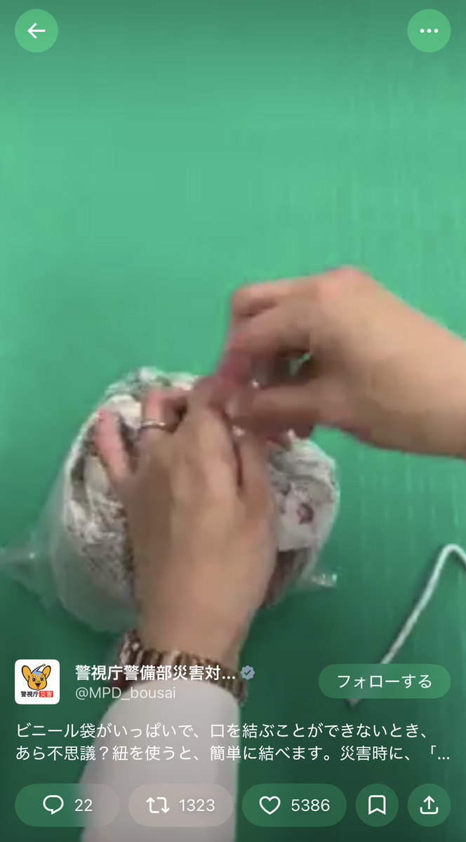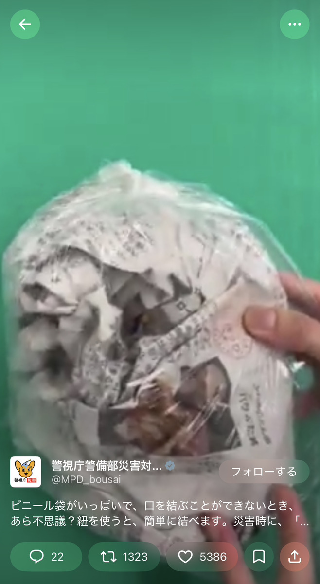 中身いっぱいのビニール袋の口、簡単に結べちゃう! 警視庁の“裏技”に「なるほど!」「手品みたい」 警視庁警備部災害対策課の公式Xアカウントより 警視庁警備部災害対策課の公式Xアカウントより 警視庁警備部災害対策課の公式Xアカウントより 警視庁警備部災害対策課の公式Xアカウントより 警視庁警備部災害対策課の公式Xアカウントより 警視庁警備部災害対策課の公式Xアカウントより 警視庁警備部災害対策課の公式Xアカウントより 警視庁警備部災害対策課の公式Xアカウントより 警視庁警備部災害対策課の公式Xアカウントより 警視庁警備部災害対策課の公式Xアカウントより 警視庁警備部災害対策課の公式Xアカウントより 警視庁警備部災害対策課の公式Xアカウントより 警視庁警備部災害対策課の公式Xアカウントより 警視庁警備部災害対策課の公式Xアカウントより 警視庁警備部災害対策課の公式Xアカウントより 警視庁警備部災害対策課の公式Xアカウントより 関連記事 “飛び過ぎるバット”の発想を応用したドライバーの実力を検証 (PR)ミズノ ナトリウムイオン電池「航空機への持ち込み不可」に…没収の恐れ エレコムの注意喚起にネット衝撃「リチウムより厳しい」 本間ゴルフ・小川社長が語る“変革の真意” 「TW777」が示す挑戦の第一歩 (PR)本間ゴルフ 【バーガーキング】ワッパーを片手できれいに!“裏技”に反響 SNS「知らなかった」「試してみます」 「あらあら~おやおや~」ハンズ公式の“におわせ”投稿が昭和生まれ直撃 80万表示の反響「懐かしすぎ!」 記事ページに戻る