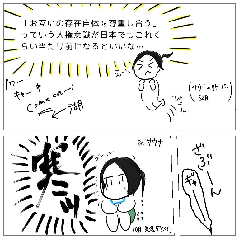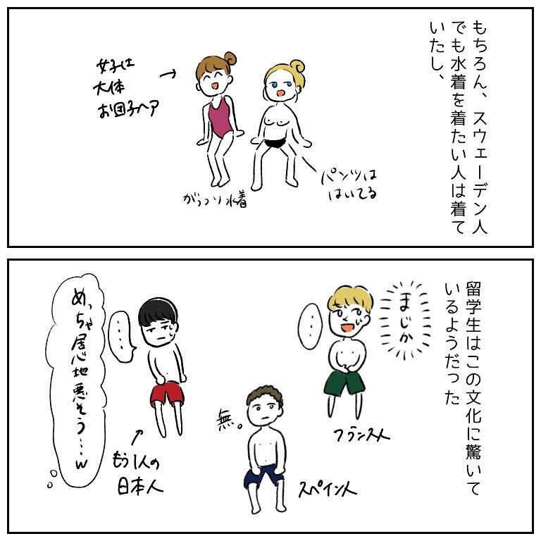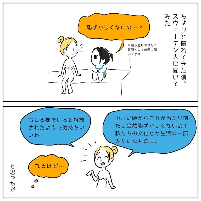 別に生殖器を見せ合う大会をやってるわけじゃない、というのはもちろん理解してるんですが…やはり恥じらいっていうやつですね。。タオル巻いたり水着着たりしたいな。スウェーデンはフルオープン当たり前とか凄すぎますね。居心地悪くてそこにいられないかも。