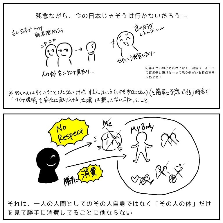 しかも漫画の中で、「気まずそうにしてる日本人もいる」って書いてるのに数ページ後には「日本じゃこうはいかないだろう」。作者さんの論調で答えるなら、教育がしっかりしてるから気まずそうにしてる人がいるってことになるんじゃないの?結論ありきで描きたいのが透けて見えてなんだかなという感じですね。日本人特有に人の体をジロジロ観てセクハラ発言もするみたいに受け取れるような描き方もしてますし。