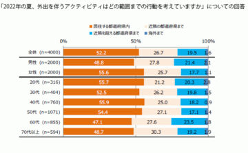 調査は6月8日~13日、インターネットで行い、4000人から有効回答を得ました。今年の夏、外出を伴うアクティビティーの行動範囲を尋ねたところ、 52.2%と最も多かったのは「居住する都道府県内」。2位は「近隣の都道府県まで」(26.7%)で、合わせて約8割の人が生活圏に近い範囲での活動にとどめる予定と回答しました。同社は「新型コロナだけでなく、最近の物価上昇も影響して、遠出を控えようという意識が強まっているのでは」と推察しています。