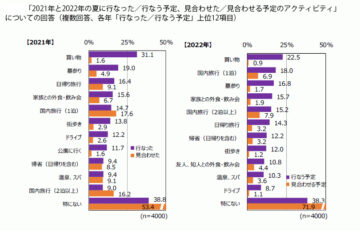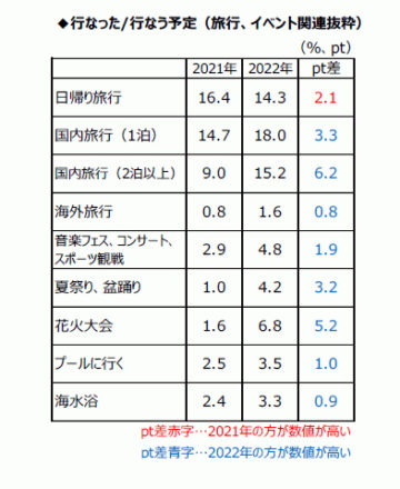 とはいえ、その内容を聞くと、「国内旅行」は「1泊」が18.0%、「2泊以上」15.2%と昨年より、いずれも増加。「友人、 知人との外食・飲み会」も、昨年の7.7%から10.8%に上がり、家族以外との行動も再開傾向といえそうです。