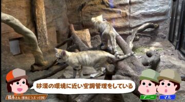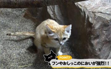 9月13日公開のスナネコは「砂漠の天使」とも呼ばれるかわいらしさで、動物園の人気者ですが、動画では、気性が荒い肉食獣で鋭い牙を持っていることや、高い湿度が苦手で空調に多大な手間と費用がかかること、発情期には大きなうなり声を一晩中上げることなどを解説。最後に、生息地の開発ですみかが奪われていきつつあることを指摘して、「動物を愛するあなただからこそ、ペットにしても幸せにできない動物がいること、知ってください」と呼び掛けています。