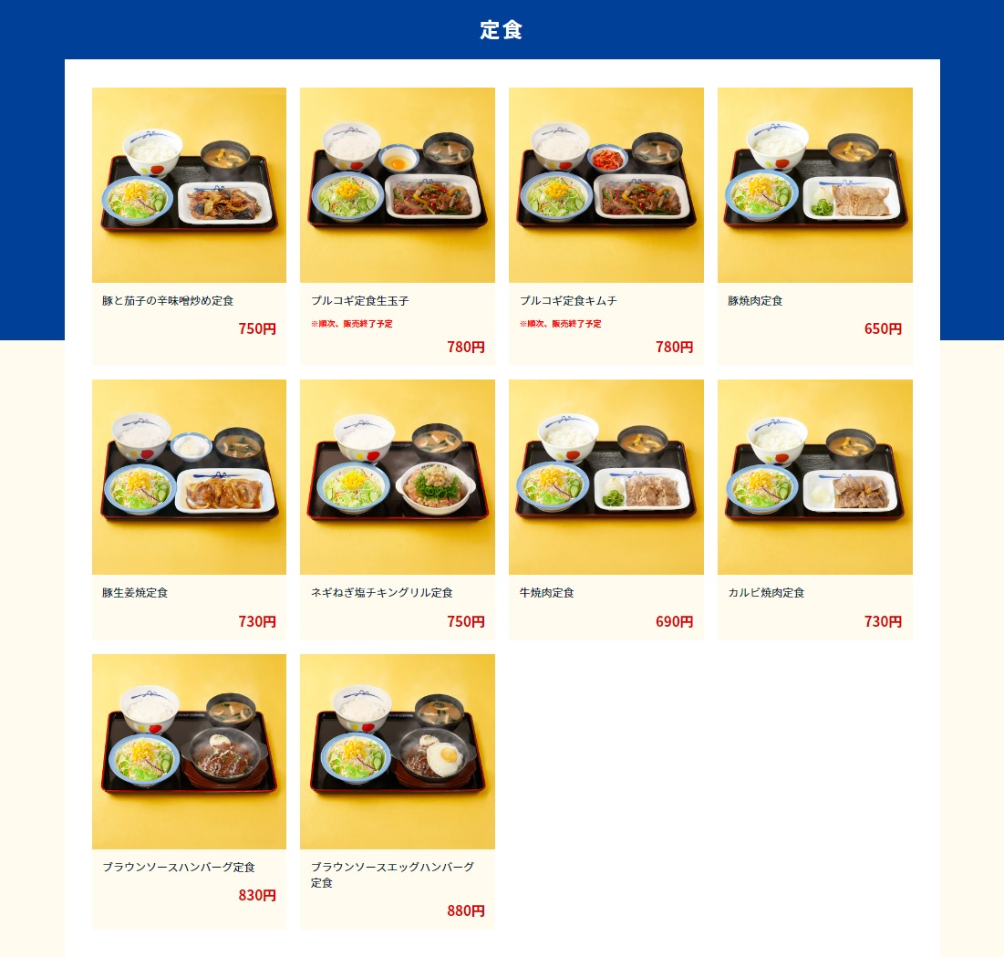 松屋の定食メニュー(松屋フーズのホームページより)