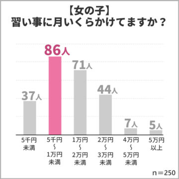 女の子も「5000円以上1万円未満」が86人で最多、「1万円以上2万円未満」が71人で続きました。「5万円以上」という保護者は5人でした。