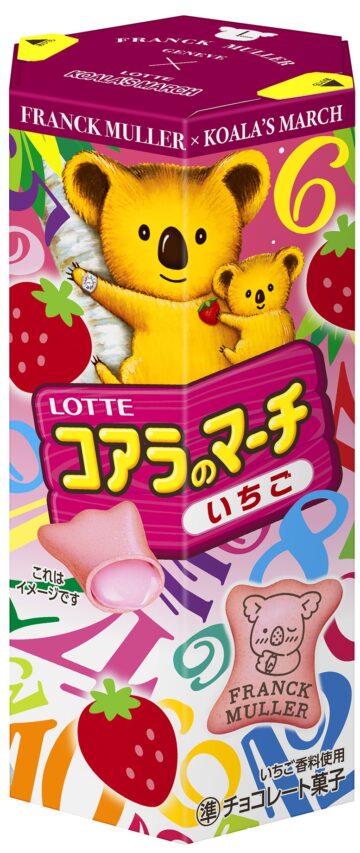 ロッテの人気菓子「コアラのマーチ」とスイスの高級機械式腕時計ブランド「フランク ミュラー」がコラボレーションした商品「コアラのマーチ<レモンタルト>」が3月21日、発売。時間がテーマになっており、フランク ミュラーの文字盤の数字をイメージしたビザン数字などがデザインされた24種類のコラボ絵柄が封入。パッケージ天面、底面内側を使って、腕時計を工作できるようになっています。