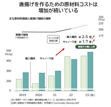 そもそも唐揚げ店には、コロナ禍で急拡大した「中食」需要の中で、冷めても味が落ちにくく、自宅での調理が敬遠されがちな唐揚げが、手軽な持ち帰り総菜として人気を集めた背景があります。店舗側でも、少ない店舗面積など初期投資が低く、オペレーションが容易で、原料も安価な鶏肉であることから新たな飲食ビジネスとして唐揚げに注目する企業が増え、「ここ数年で爆発的に店舗が増加」しました。