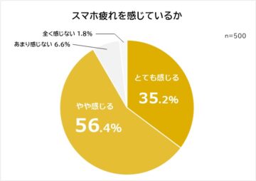 次に「スマホ疲れを感じているか」という質問では、「とても感じる」が35.2%、「やや感じる」が56.4%で、計91.6%と9割以上の人がスマホ疲れを感じているとわかりました。