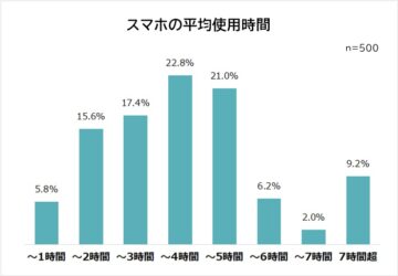 「スマホの平均使用時間」を聞いたところ、「~4時間」が22.8%と最も多く、次いで「~5時間」が21.0%、「~3時間」が17.4%、「~2時間」が15.6%、「7時間超」が9.2%、「~6時間」が6.2%、「~1時間」が5.8%、「~7時間」が2.0%という結果でした。500人の平均使用時間は「4.3時間」だったということです。