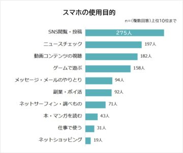 「スマホの使用目的」も質問したところ、3位は「動画コンテンツの視聴」で182人、2位は「ニュースチェック」で197人、1位は「SNS閲覧・投稿」で275人でした。