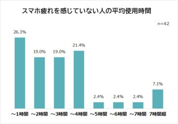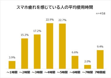「スマホ疲れを感じる」と答えた人と「スマホ疲れを感じない」と答えた人のスマホ使用時間を比較したところ、疲れを感じている人の平均は「4.4時間」、感じていない人の平均は「3.1時間」でした。