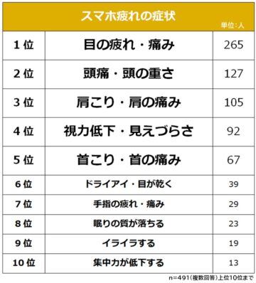 “スマホ疲れ”で感じる症状では、3位が「肩こり・肩の痛み」で105人、2位が「頭痛・頭の重さ」で127人、1位が「目の疲れ・痛み」で265人でした。