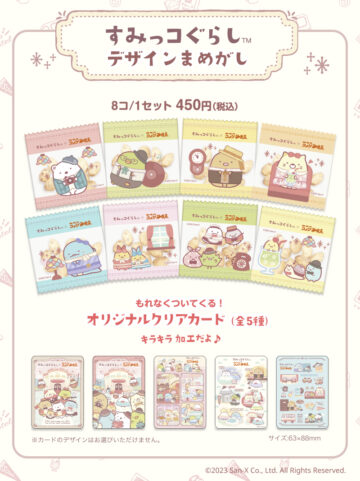 「すみっコぐらしデザインまめがし」(450円)は、スナック菓子「まめがし」にすみっコたちがデザインされた全8種類の限定パッケージで提供。全5種類のオリジナルクリアカードがランダムで1枚付いてきます。