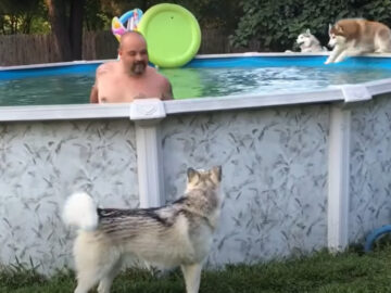 その後もプールを諦められないハスキーたちは、何度も「プールに入れて!」と、ジャンプと鳴き声で繰り返しアピールしています。しかし、パパには聞き入れてもらえない様子。「もうこうなったら直談判だ!」と言わんばかりにパパの目をしっかり見つめて、甘い鳴き声で再度のお願いをし……という展開です。