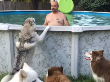 注目を集めたのは「Impatient husky」という動画。冒頭、ハスキーたちがプールの周りをソワソワ、ウロウロしている様子が映し出されます。中で掃除をしているパパをのぞき込み、甘えた声を出して猛アピール中。「プールに入りたーい!」「お願~い。今すぐプールに入りたいの。入れて~!」と何度もおねだりしている様子です。