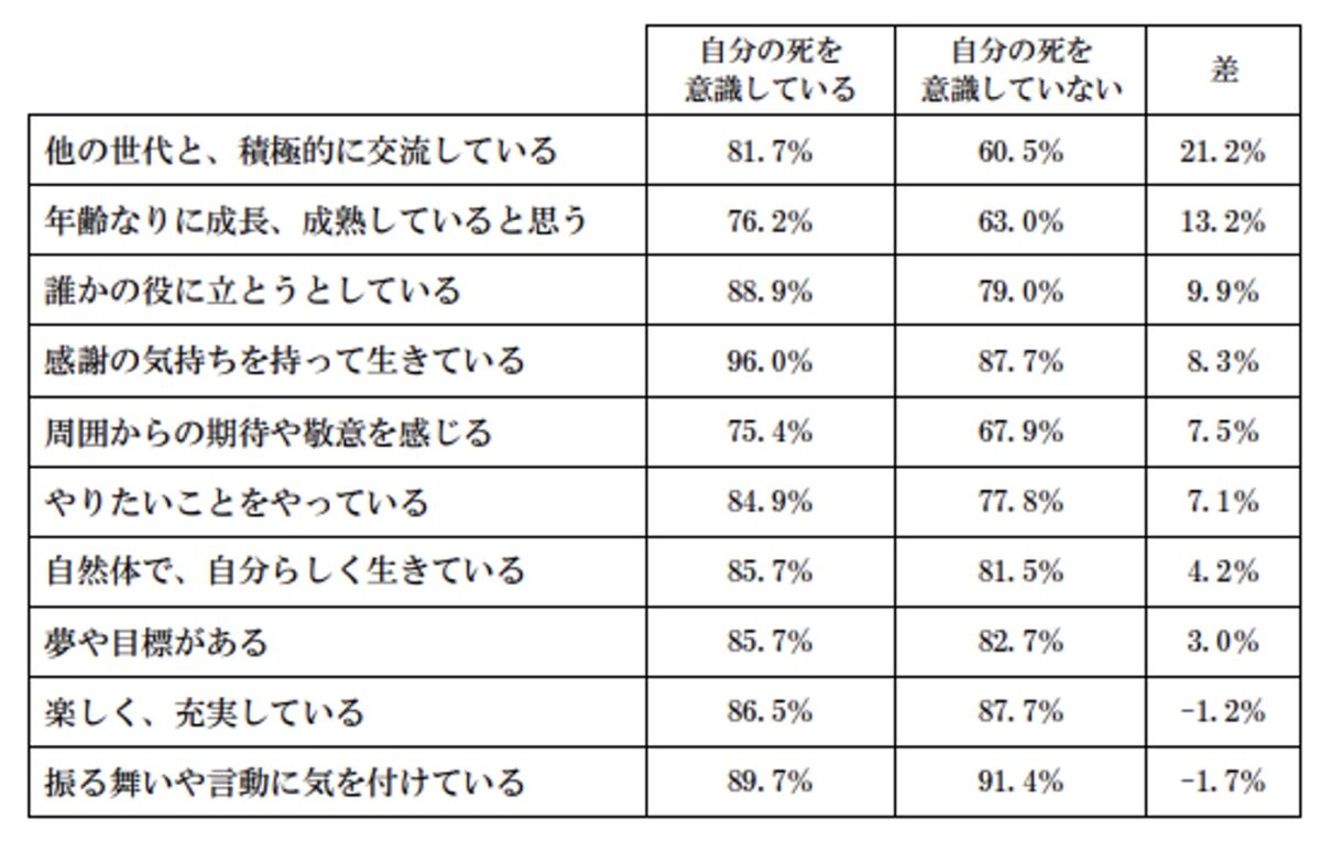 これを見ると、死を意識している人の方が社会参加への意欲が高く、前向きな思考を持っていることが分かります。先述した「死を想像する」ことが生きがいを生み、前向きに生きるきっかけになるということが分かっていただけるでしょう。