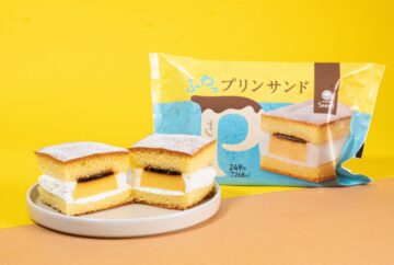 「プリンサンド」は、北海道製造生クリームをブレンドしたホイップクリームと、固めのプリンを“ふわふわ”生地でサンドした一品。半分に割ると中からプリンが現れる、見た目のインパクトも特徴的な“進化系プリン”スイーツです。価格は268円(以下税込み)。