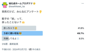 餃子(ギョーザ)作りで皮が余る悩み、よく耳にしますよね。「サランラップ」などの製品でおなじみの企業「旭化成ホームプロダクツ」が公式Xアカウントで実施したアンケートによると、全体の41.8%の人が、餃子の皮を「余らせてしまう」そうです。