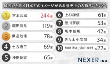 インターネットリサーチなどを行うNEXER(東京都豊島区)と日本刀、刀剣の販売・買取を行う「永楽堂」(同墨田区)が共同で「最強だと思う日本刀のイメージがある歴史上の人物」に関するアンケートを行い、結果を紹介しています。調査は4月28~30日にかけて、男女1000人にインターネットで実施。回答をもとにランキングを作成しています。