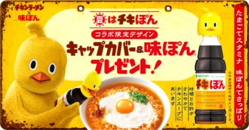 2024年に「味ぽん」ブランドが発売を開始して60周年を迎える「Mizkan(ミツカン)」(愛知県半田市)が、日清食品のロングセラーブランド「チキンラーメン」とコラボレーションしたキャンペーンを6月1日から実施します。同月3日から、「味ぽん」の公式Xアカウントで「コラボレーション企画限定デザインの味ぽん360ml」1本と、「ひよこあにきキャップカバー」1個が当たるキャンペーンが行われます。