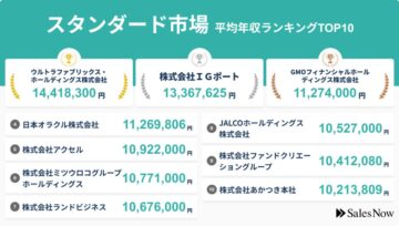 国内540万社の企業データを基盤に営業の効率化を支援する「SalesNow」を展開するSalesNow(東京都渋谷区)が、上場企業(スタンダード市場)を対象とした「平均年収ランキング」を発表しました。