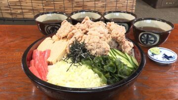 桶盛り唐揚げ親子丼は、特製ダレに漬けた唐揚げ15個を6個分の卵でとじ、白米1.5キロの上にのせたもので、総重量が2キロ、5人前相当になっています。