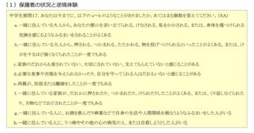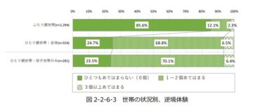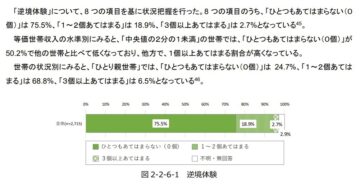 内閣府が公表している調査結果「令和3年 子供の生活状況調査の分析 報告書」によると、保護者との関係の中で複数の逆境体験を経験した人は2割前後存在しています。逆境体験の項目には、一緒に住んでいる大人から悪口を言い立てられる、身体を傷つけられるといった心身の危険に関わる事や、家族の誰からも愛されていない、大切にされていないと感じるなど、精神的な面もあります。