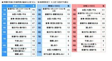 ソニー生命保険(東京都千代田区)が、事実婚を含む配偶者がいる20~39歳の女性500人に「20代・30代共働き夫婦の生活意識調査」を実施。その一環で調べた「配偶者に対して、結婚前の期待を“下回っている”と感じること」の結果をランキング形式で紹介しています。