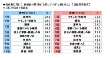 ソニー生命保険が「配偶者に対して、結婚前の期待を“下回っている”と感じること」の調査結果をランキングで紹介!