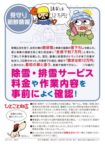 国民生活センターは、「急に大雪が降っても慌てないように、あらかじめサービス内容や料金の情報を収集しておくとよいでしょう」とアドバイスしています。