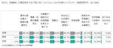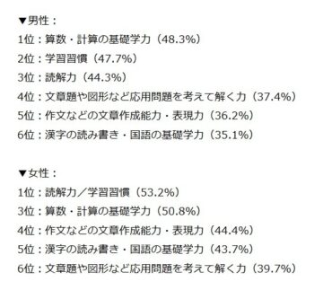 父親で最も高かったのは「算数・計算の基礎学力」で48.3%、続いて、47.7%の「学習習慣」、44.3%の「読解力」という結果でした。一方、女性で最も高かったのは「読解力」「学習習慣」で共に53.2%、次いで50.8%の「算数・計算の基礎学力」でした。