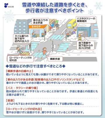 積雪時に外出する際は滑りやすい場所を避け、靴底が滑りにくいものを選ぶなど、歩行時の転倒に注意するよう、内閣府大臣官房政府広報室が政府広報オンラインの公式Xアカウントで注意を呼び掛けています。