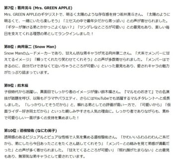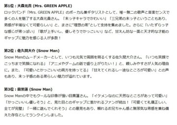 1位はロックバンド「Mrs. GREEN APPLE」の大森元貴さんでした。魅力として「歌がうまいし、優しそうでかっこいい」「末っ子キャラでかわいい」「いたずらっ子な感じが弟っぽい」という感想が見られたとのことです。