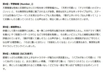 4位は人気グループ「Number_i」の平野紫耀さんでした。「天然でかわいい」「ドジでかわいいけどかっこいい」「歌がうまいから『なんか歌って!』ってお願いしたら歌ってくれそう」などの意見が見られたということです。